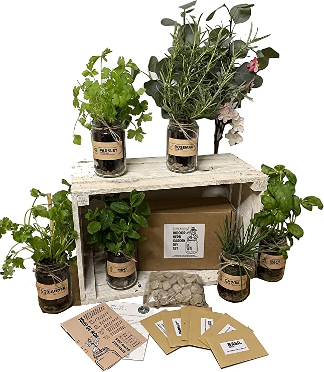 The Herb Garden Planter by Planter Pro’s is a rustic, wooden planter box designed for growing a variety of herbs indoors. This kit comes with everything you need to get started, including seeds, soil, and wooden plant markers.